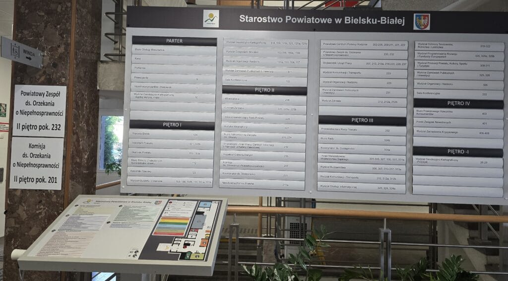 W Starostwie Powiatowym w Bielsku-Białej od kilku lat sukcesywnie wprowadzane są rozwiązania, które poprawiają dostępność budynku oraz jego otoczenia i zapewniają bardziej komfortową obsługę klientom – w tym osobom z niepełnosprawnościami, seniorom i osobom z czasowymi trudnościami w poruszaniu się. W ramach działań modernizacyjnych, częściowo realizowanych przy wsparciu Państwowego Funduszu Rehabilitacji Osób Niepełnosprawnych (PFRON), w ostatnim czasie wprowadzono m.in.: