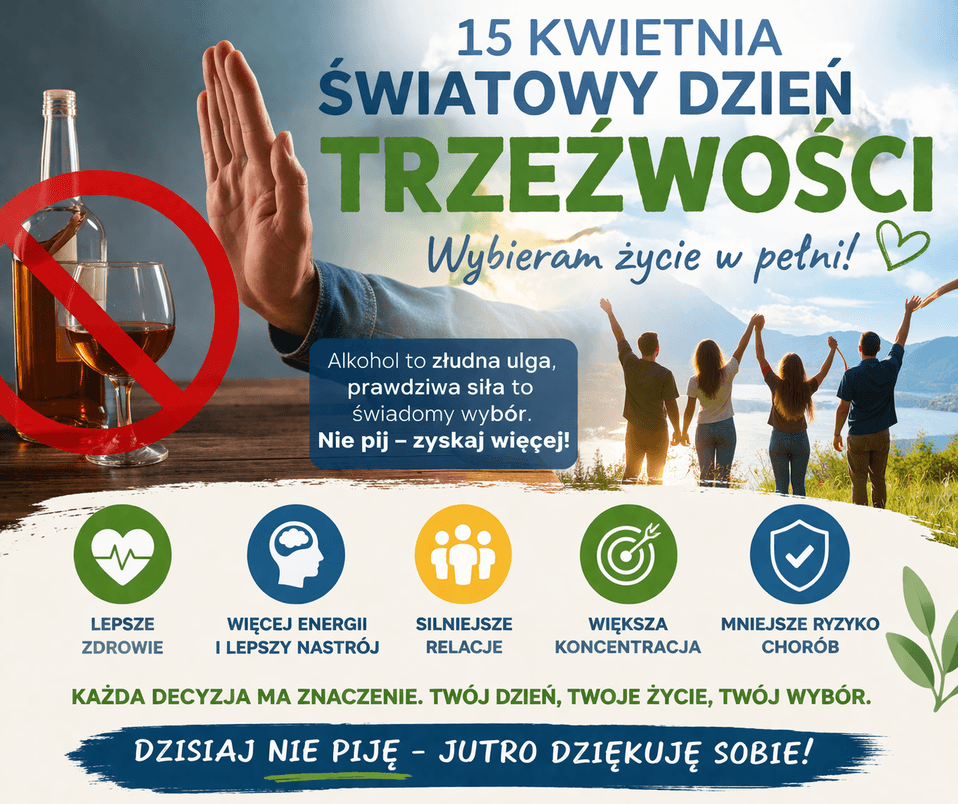 15 kwietnia obchodzony jest Światowy Dzień Trzeźwości – inicjatywa promowana przez Światowa Organizacja Zdrowia, której celem jest zwrócenie uwagi na skalę problemu, jakim jest spożywanie alkoholu oraz jego wpływ na zdrowie i życie społeczne. Tego dnia zachęca się, aby choć na chwilę zatrzymać się i zastanowić nad własnymi nawykami oraz – symbolicznie – powstrzymać się od picia alkoholu.