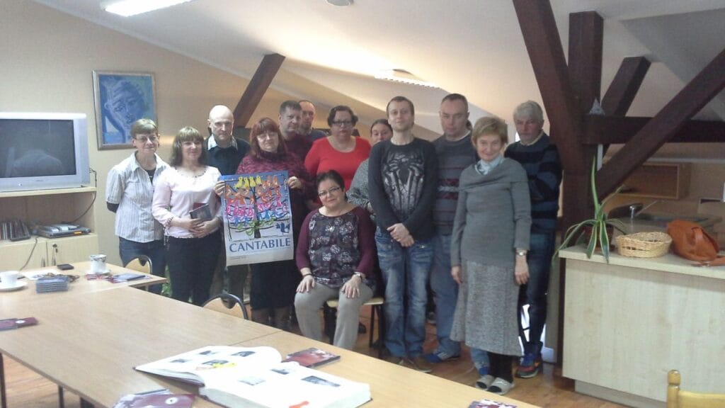 Jadwiga Kos, współzałożycielka i dyrygentka Chóru „Cantabile” podczas wizyty w ŚDS, opowiadała o początkach powstania zespołu, narodzinach nazwy, która wywodzi się od włoskiego terminu cantabile – czyli śpiewnie. Wyjaśniła, że wszystkie nazwy muzyczne mają rodowód włoski, a uczestnicy spotkania miło ją zaskoczyli znajomością muzycznych terminów np. allegro, largo czy vivace. Dyrygentka mówiła o koncertach, zagranicznych wyjazdach, udziałach w festiwalach ale także o trudnej systematycznej pracy, polegającej na ćwiczeniach i rozśpiewaniu.