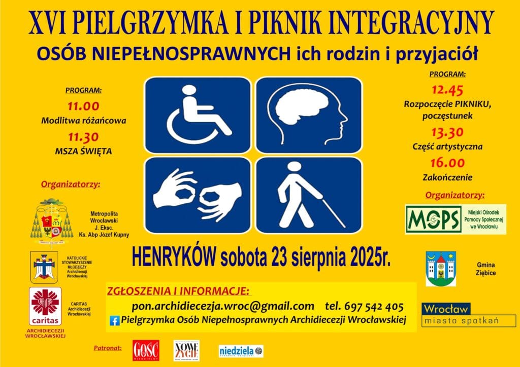 Ks. Abp Józef Kupny, Metropolita Wrocławski Katolickie Stowarzyszenie Młodzieży Archidiecezji Wrocławskiej Caritas Archidiecezji Wrocławskiej Diecezjalny Duszpasterz Osób Niepełnosprawnych ZAPRASZAJĄ do udziału w XVI PIELGRZYMCE OSÓB NIEPEŁNOSPRAWNYCH, ich Rodzin i Przyjaciół do HENRYKOWA w dniu 23 sierpnia 2025r.